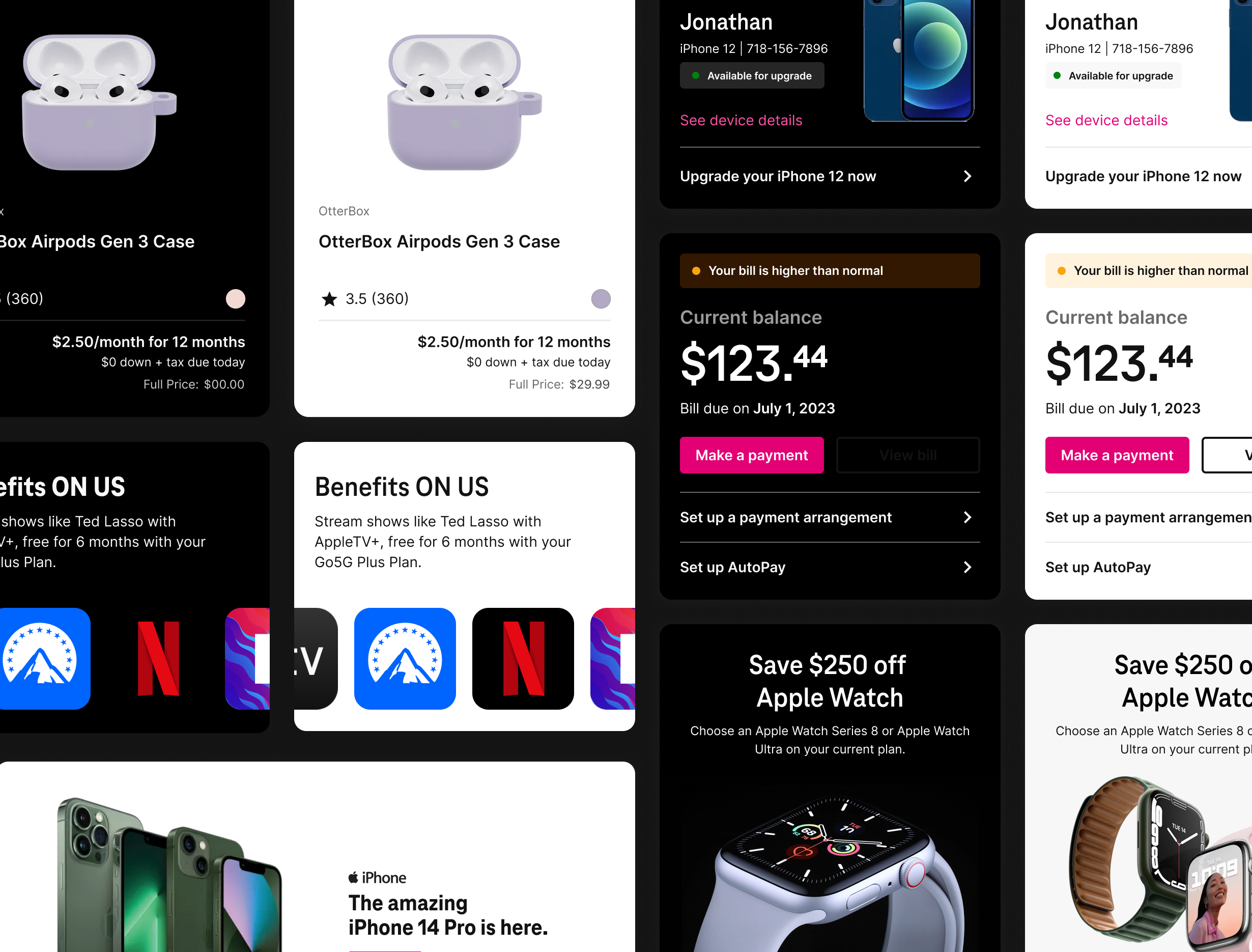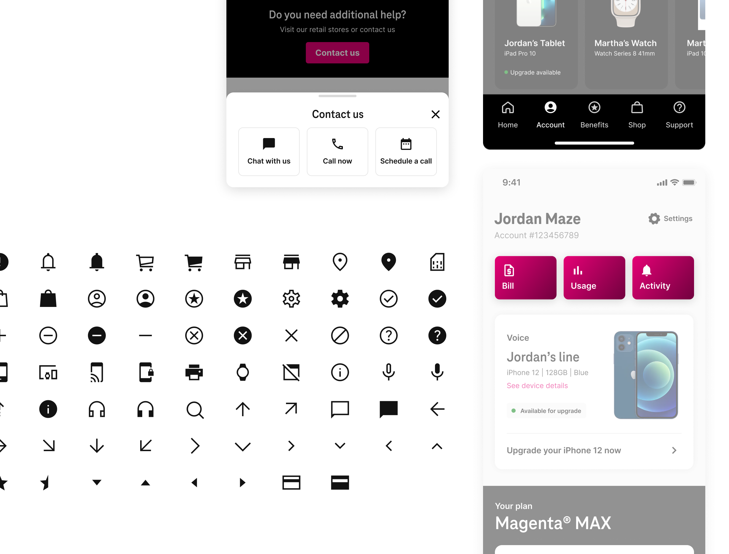 I led the creation, optimization, and maintenance of Arrow, T-Mobile’s design system, to unify a fragmented digital ecosystem and improve speed, quality, and consistency at scale. In close partnership with design and engineering, we consolidated five disparate systems into a single, flexible foundation now powering web, app, and employee experiences across the company. I defined Arrow’s architecture, governance, and expressive language—balancing brand consistency with the flexibility needed to support over 120 teams and future subsidiary brands. Built from a shared library of atoms, components, and patterns, Arrow scales across use cases from marketing and commerce to complex support tools, with accessibility and legal considerations built in. Today, Arrow underpins T-Mobile’s digital experience, enabling teams to ship faster while maintaining a unified, high-quality brand presence.