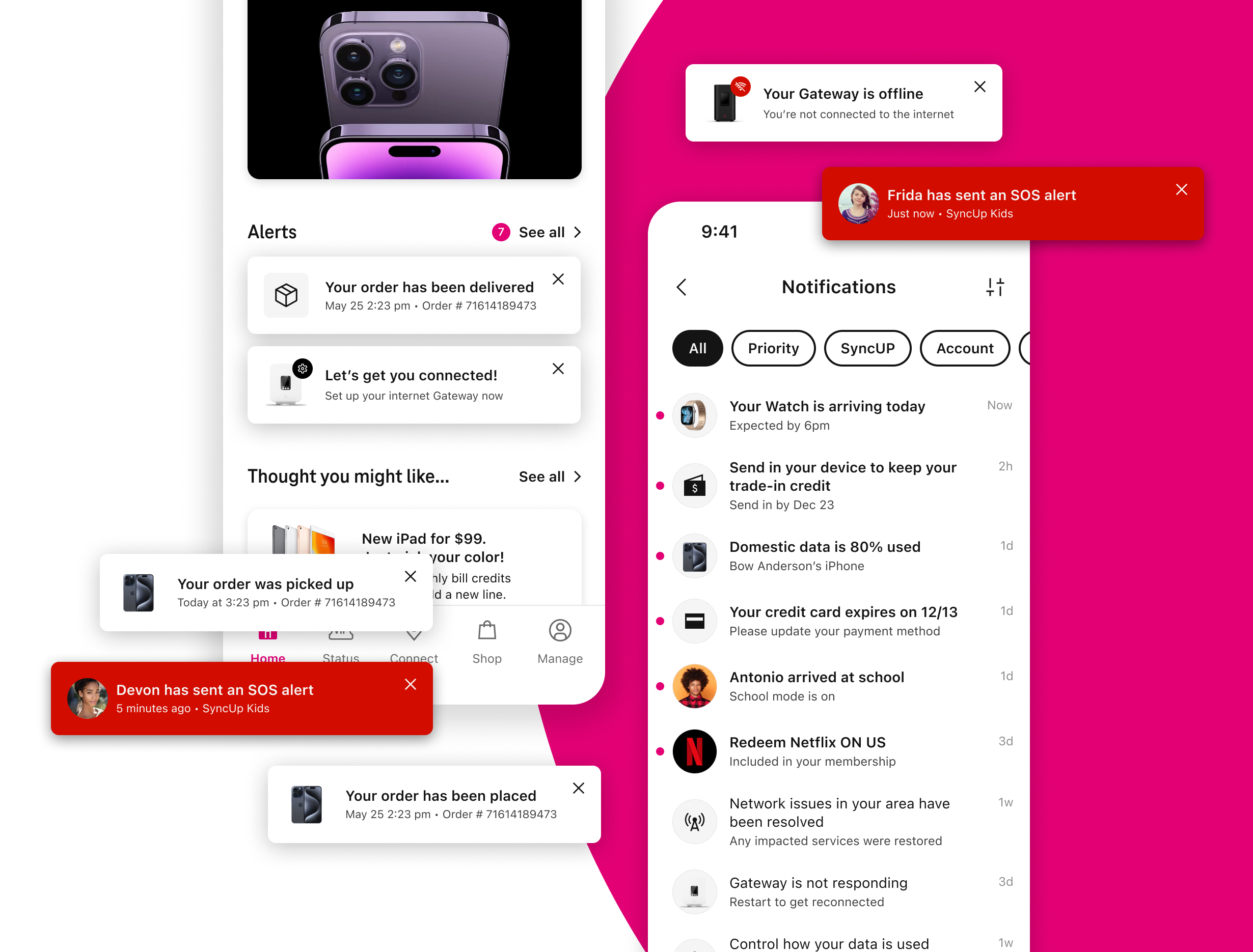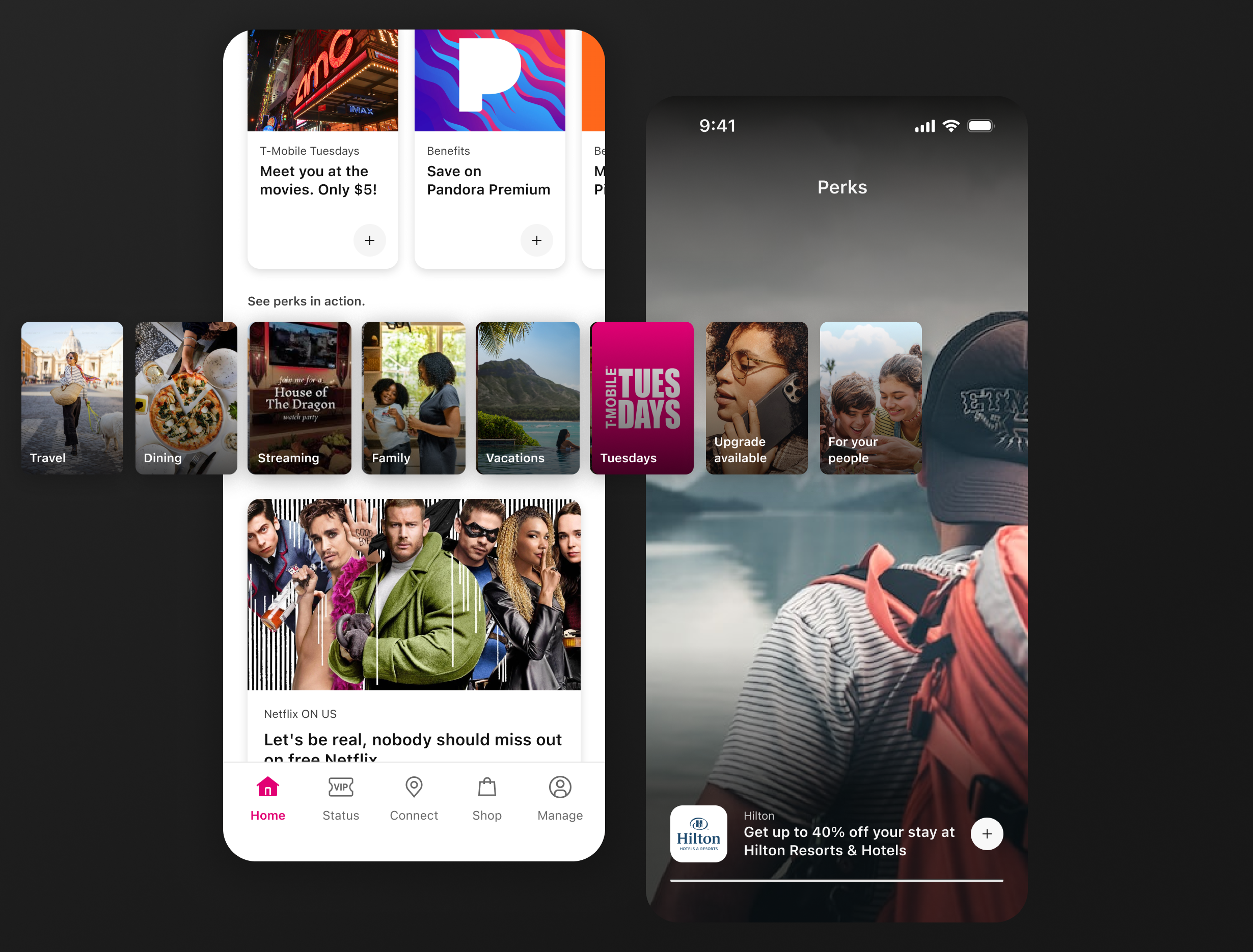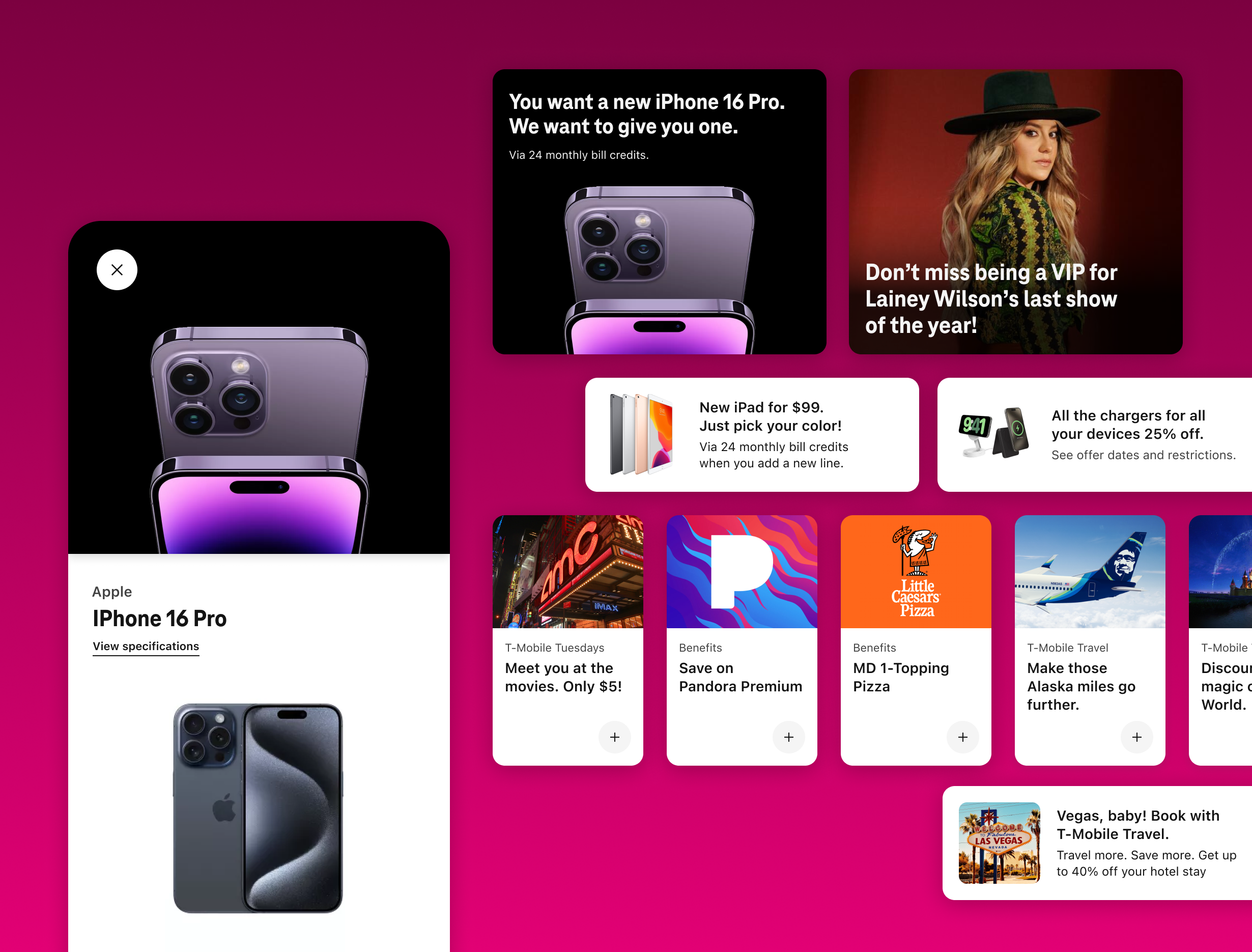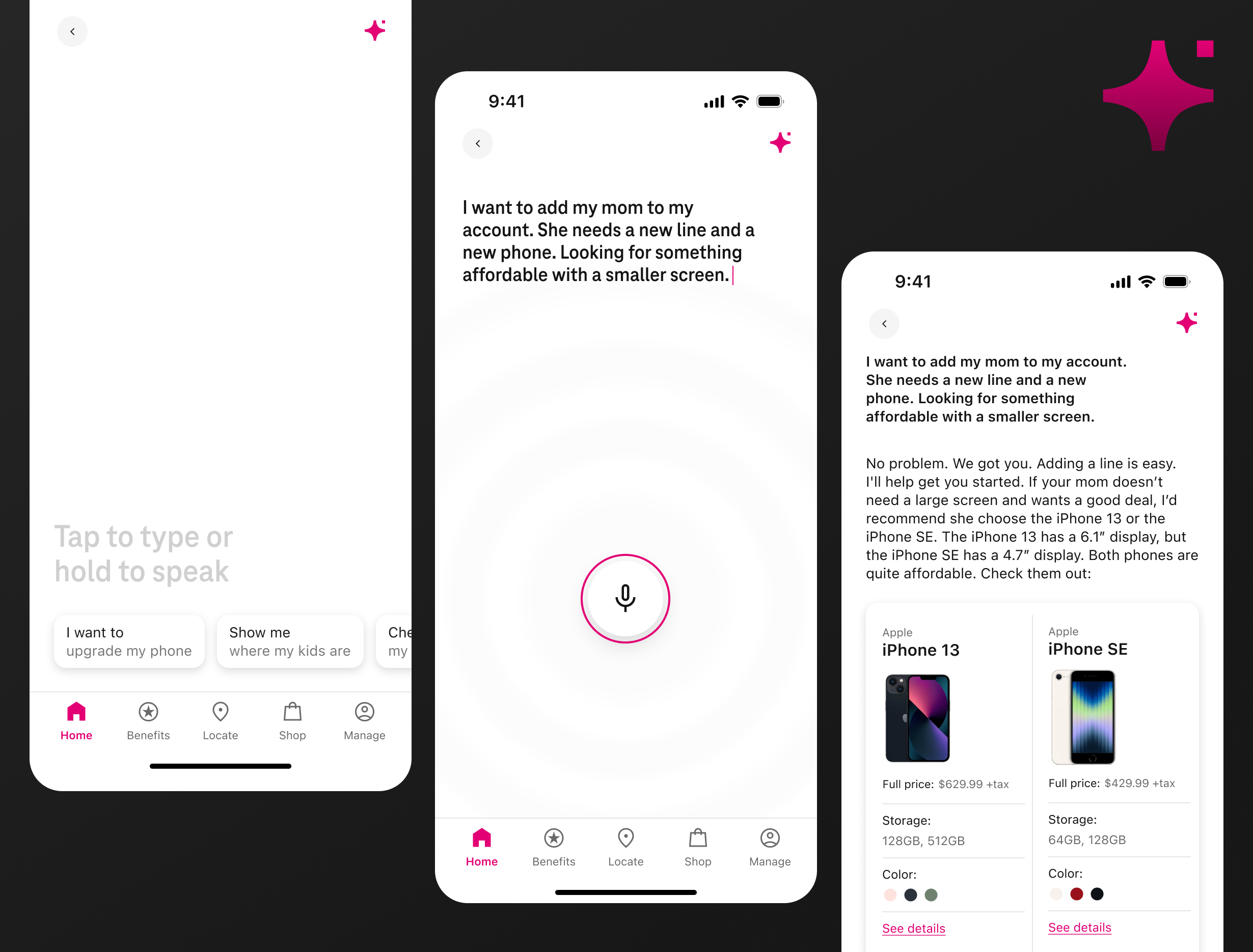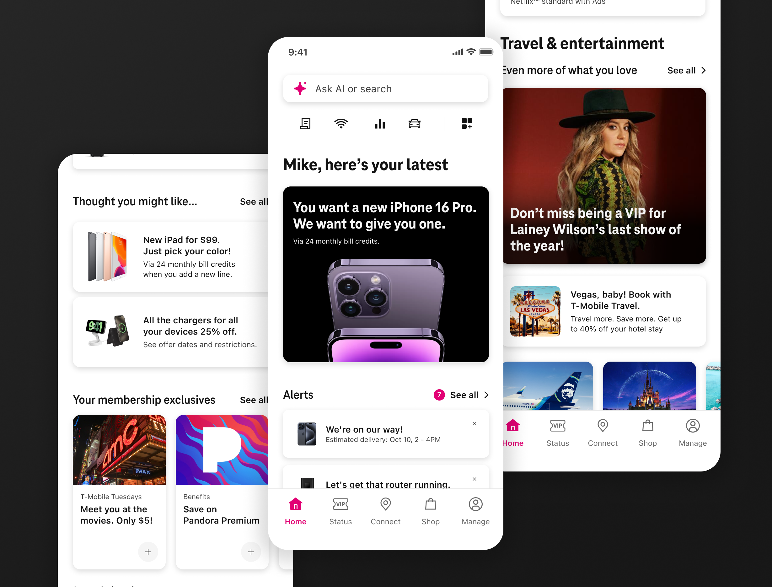 I led the reimagining of T-Life Home, the front door of T-Mobile’s new super app unifying 124 products and features under a single experience. The mandate was to help customers get to what matters faster while laying the groundwork for predictive, contextual experiences powered by machine learning. I helped define the north star for Home and guided the team over six months of iteration to evolve it into a flexible, intelligent surface. We designed a smarter engine to power content prioritization, alerts, and personalized offers, and delivered three complementary home experiences—a traditional feed, a product and services dashboard, and an AI-powered assistant—giving users multiple paths to value while positioning T-Mobile for the future of adaptive digital experiences.